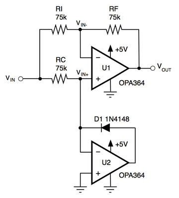 较近的许多设计都依靠单电源运算放大器 (op amp) 的饱和行为来实现整流。在许多情况下,这样做是可以接受的,但如果您想避免出现运算放大器饱和以及这种饱和带来的许多固有问题(缓慢的恢复时间、潜在的非理想相位反向),则图 1 所示电路是一款较好的解决方案。