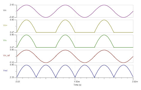图 4 显示了图 3 电路的运行情况。图 4 中,顶部轨迹线 (Vin) 参考中间电源电压,因此它似乎为双极—标识为 Vin_ref 的轨迹线为参考电压的实际输入电压,其在所有时间都明显地维持在参考电压以上。