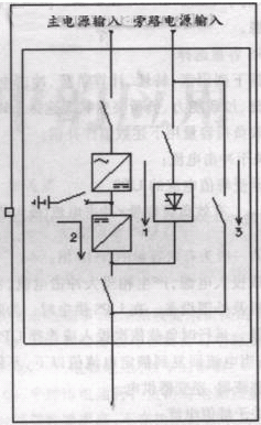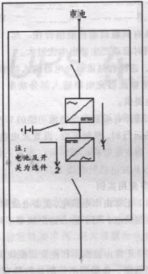 图2正常由整流器和逆变器模块供电。如果主电源故障,负载则不间断地转换到由电池供电,仅在逆变器故障或电池放电终了,负载将转换到旁路供电。