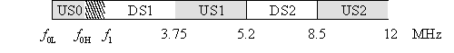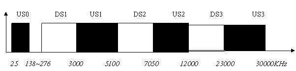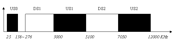 Annex A, 北美地区,频谱分配如图一,其中USx对应上行频带, DSx对应下行频带,US0的起始频点从4 kHz 到25 kHz之间变化, 取决于是否有POTS(传统语音业务),中止频点从138KHz到276 kHz之间变化,取决于是否上行需要更高的速率.