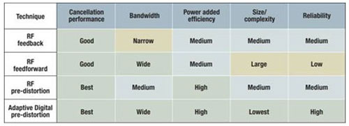 图2:用于提高功率放大器线性度的常用技术之间的比较。