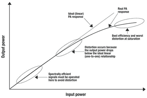 过去的无线标准使服务提供商在接近较大输出功率下才运行基站,从而实现较低的资本成本(覆盖同一区域所需的基站更少),而且运行成本也较低(电力成本更低)。但随着无线用户数量的爆炸式增长以及通过基础局端传输的数据量大幅增长,这一状况发生了改变,原因是还有 PA 第三个特性的存在:失真随着输出功率的增加而相应增加,而当 PA 开始与理想(线性)曲线背离时,失真变得异常突出。