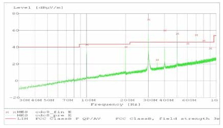 由于两个原因,时钟信号常归咎于 EMI。即使时钟低频率运行,较好的时钟上升/下降沿也包含大量的奇次谐波,其在更高频率时会引起 EMI。另外,时钟通常会在板上传播一段较长的距离,从而更可能给其他组件带来干扰。通常,EMI 可通过频谱分析仪测量,如图 1 所示。图中,绿色信号存在一些超出红色 FCC 屏蔽的频率分量(300MHz、400MHz 和 500MHz 等)。