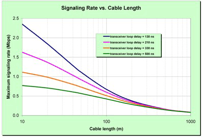下面显示了信号速率和线缆长度之间的权衡因素,以及收发器延迟带来的影响。收发器带来的延迟(包括相关隔离、电平转换和保护)对于 500 kbps 及以上的信号速率特别明显。