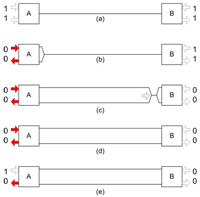 我们的下一种情况(图 2)假设,节点 A 再次发起一条消息,但是节点 B 在稍后发起的一条消息具有更高的优先级。如前所述,这种情况以两个节点均处在非占用模式作为开始,如 (2a 所示,随后节点 A 变为占用(如(2b)所示)发起一条消息。该占用差动电压再次沿线缆传输。在信号到达 B 处的收发器以前,该节点刚好利用如(2c)所示占用位发起一条消息。这时,两个节点都正传输一个占用位,并且两个节点都正接收一个占用位(如(2d)所示),然后两个节点都没意识到另一个节点也已启用。由于在我们的假设情况中,节点 A 具有比节点 B 更低的优先级,因此有时节点 A 会通过将其 TXD 设置为 0(如(2e)所示)来发出一个非占用位。但是,由于节点 B 的作用,RXD 会感应到总线仍然处在占用状态下。