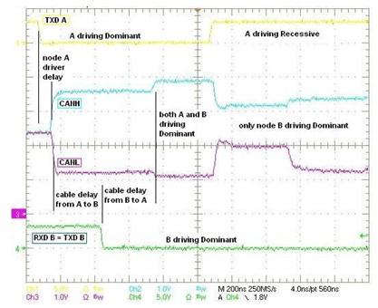 当一个以上节点要在共用总线上发送信号时,控制器局域网 (CAN) 协议的一个关键特性就是如何处理总线争用问题。CAN 使用逐位仲裁 (bit-wise arbitration) 来选择哪一个节点应该继续信号传输。由于这些节点对每一个比特位进行监听,并且必须服从于更高优先级的消息,因此它们的响应时间必须快到能够在破坏下一个比特以前终止传输。如下面三种情况所述,这就对容许组件延迟和线缆长度以及可用信号速率构成了一些限制。