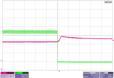 图 2 显示了断路测试时的 LED 电流和升压转换器的输出电压。LED 电流立即从 0.35A 下降到 0A,继而输出电压升高。齐纳二极管一旦达到 36V 的钳位电压,齐纳电流随即产生,调节过程也重新确立,输出电压将保持在 36V。由于控制环路的响应时间问题,在转换期间输出电压会出现轻微的过冲。
