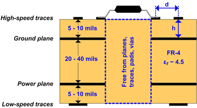 过孔电感增加信号路径电感时,避免各层随快速信号迹线改变。