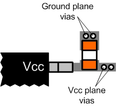 通过将电容的电源端直接连接至器件的电源端、然后经过孔连至 Vcc 层,在器件上安装小容量的 0.1 μF 或 0.01 μF 旁路电容。经数个过孔将电容接地端连接至接地层(请参见图6)。