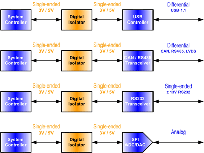 -不符合任何特定接口标准-使用 3V/5V 逻辑开关技术-专为电隔离数字、单端 (SE) 数据线而设计较后一点似乎为一种设计限制,然而图 2 显示了如何对多种接口进行隔离,其中包括低压 SPI、高压 RS232、差动 USB 和差动 CAN/RS485。