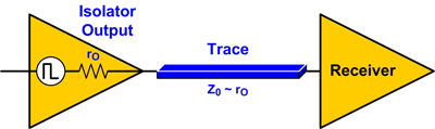 受控阻抗传输线是特性阻抗 Z0 始终受控于其几何特性的迹线。迹线长度大于 15mm(tr = 1ns)和 30mm (tr = 2ns)时,迹线阻抗必须要与隔离器输出阻抗 Z0 ~ rO 匹配(如图 4 所示)以较小化信号反射。这被称为源阻抗匹配。