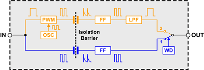 蓝色部分所示路径中处理的高速信号被电容式隔离层区分为多个快速瞬态。随后的触发器 (FF) 将这些瞬态转换成在波形和相位方面均与输入信号一致的脉冲。内部看门狗定时器 (WD) 检查 高速信号边缘的定期出现。在低频输入信号情况下,连续信号边缘之间的持续时间会超出看门狗定时器窗口。这样便迫使看门狗定时器将输出开关位置从高速路径(位置 1)改变为低速路径(位置 2)。