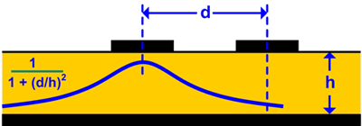为了将串扰降至 10% 以下,需保持信号迹线为迹线至接地高度的三倍(d = 3h)。信号迹线下的回流密度遵循 1/ [1+(d/h)2] 函数,因此其在 d > 3h 点上的密度会非常低,从而避免邻近迹线中出现较大的串扰(请参见图 5)。