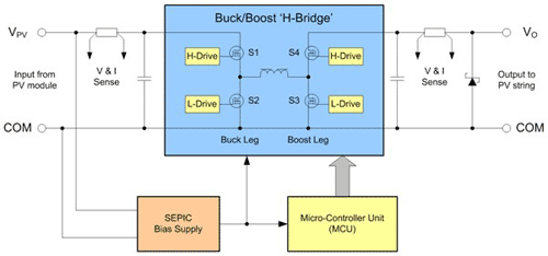 图 5 显示了一个典型的微型转换器结构图,其连接一个单太阳能 PV 模块。三个主要的元件分别为:H 桥接电源电路、微型控制器和偏置电源。H 桥接电源电路为微型转换器提供在降压(电压步降)和升压(渐升压)压开关转换模式中运行的灵活性。降压站 (buck leg) 由同步开关对 S1–S2 构成,而升压站 (boost leg) 则由 S3–S4 构成。当VPV ??VO时,降压站开启。当VO ? VPV 时,升压站开启。无论哪个站开启,另一端都会处于闲置,并且其顶部开关永久开启。
