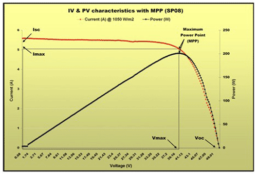 图 2 显示的是 1050 W/m2 辐照条件下一个模块 (SP08) 产生的 IV(电流电压)曲线和 PV(电源电压)曲线。MPP 位于靠近 IV 曲线膝部的地方,其中电流和电压乘积较大化。