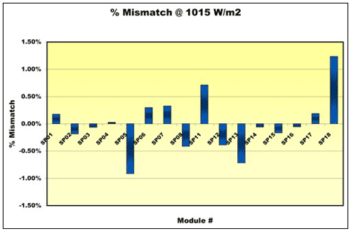 图 4 显示了某种给定辐照条件下所有模块的不匹配。不匹配范围在 –0.9% 到 +1.25% 之间变化。一块静止或动态云或任何其他现实条件都可能会增加不匹配率。模块电子器件可以处理这种情况。