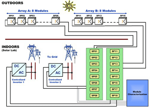 8 个模块 (SP01–SP08) 串联在一起,然后连接至串逆变器 1。类似地,另外 8 个模块连接至串逆变器 2。所有这 16 个模块均由相同厂商生产单晶硅太阳能电池组成,在 1000 W/m2 和 25oC标准工作条件下其额定功率为 215W。来自逆变器的 AC 电能被送回本地电网。可单独对每一个模块的性能实施 MPP 运行监控。