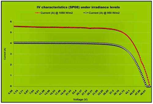 在无不匹配条件下,一个阵列(8 个串联组件)的较大总功率等于单个模块功率的和。在没有模块 MPP 和不匹配条件下,该阵列产生的较大总功率始终小于单个模块较大功率的和,这是因为一些模块正工作在其较大功率点以下。1015 W/m2 辐照条件下,利用连接模块 SP01–SP08 的阵列,不匹配率为 2.4%,也即 37W 的损耗。