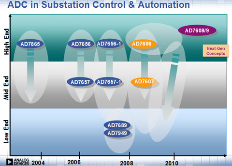随着全球电网持续的发展,电力线监测、继电保护产品在不断地更新换代并改变着设计模式。作为全球领先的高性能信号处理解决方案供应商,ADI公司 ( http://www.analog.com/zh/pr0513 )推出的系列高性能ADC一直引领该领域的技术发展路线:第一代电力继电保护产品均采用模拟开关,采用单通道16位ADC(如AD976 (http://www.analog.com/zh/pr0513/ad976)、AD574)进行设计;后来出现了使用16位的AD7656 (http://www.analog.com/zh/pr0513/ad7656)和14位的AD7865 (http://www.analog.com/zh/pr0513/ad7865)配合模拟开关的第二代继电保护产品,AD7656和AD7865在当前很多电力继电保护产品中仍有非常成功的应用案例;随着技术的更新和产品工艺的改进,尤其是其±10V双极多通道同步输入等技术特点,使AD7656成为上一代电力继电保护的主流选择,目前该产品仍在大量的电力监测及保护设备中发挥重要作用。