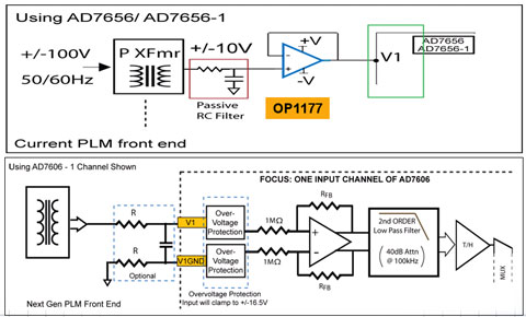 图2:AD7606进一步简化电路设计(上下图分别为采用AD7656和AD7606的电路示意图)。