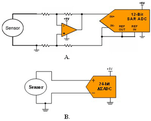 (A) 显示的是一个通过放大器连接至转换器的传感器;24 位Δ-Σ
