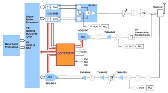 CDCE72010 可做为驱动多个高速组件的集中式时序解决方案,例如接收路径中的 ADC、功率放大器线性化回馈回路中的 ADC、传输路径中的高速 DAC,以及后续的 DUC/DDC/DPD 处理器。所有这些都需要精确的频率,回馈回路 ADC 更是其中较为关键的一环。