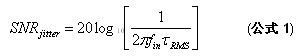 其中是输入频率,而是包括孔径抖动与频率抖动的 RMS 抖动。此公式显示,抖动愈低,SNR 愈佳。在相同的抖动程度之下,SNR 会因为输入频率提高而变得不佳。其中也显示取样频率不是造成 SNR 劣化的因素。