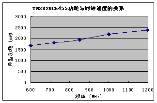 其中,Cpd为动态电容,F为开关频率,Vcc为电源电压。上述关系中包含两个重要概念:动态功耗与开关频率呈线性关系,与电源电压呈二次关系。下图列出了TMS320C6455在不同工作频率下的典型功耗。