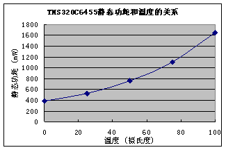 DSP 工艺 静态功耗所占比例 TMS320C6201 180nm <1% TMS320C6416 130nm 11% TMS320C6455 90nm 24%对于较新的基于65nm工艺的DSP,静态功耗所占的比例达到50%左右。另外,静态功耗也受DSP工作温度的影响,下图列出TMS320C6455在不同温度下的静态功耗。