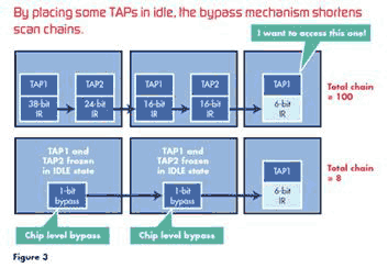 IEEE 1149.7 的全新芯片级旁路功能可冻结器件中无关的 TAP 控制器,将扫描位从 100 个减少为 8 个(图 3)。这就减少了需要在系统中移出的位数,从而大幅提高了扫描链的性能。此外,该机制还可发挥防火墙的作用。如果目标电路板在工作时采用热连接,防火墙就非常实用。在 IEEE 1149.1系统中,连接至正在运行的目标可能导致不可预计的运行情况,这是因为这种连接可能会导致调试逻辑的混乱,从而产生电气问题。有了旁路机制作为防火墙,只有启动预确定的序列才能访问芯片 TAP。这一步骤可确保调试测试系统只有在目标有了稳定的电气连接后才能建立连接。