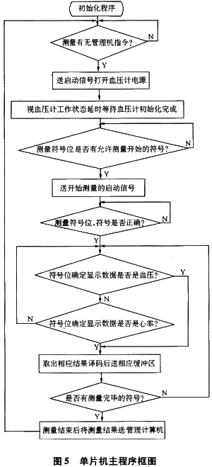 单片机要完成的任务,一是要接收管理计算机指令,按设定时间开启电源、启动血压计开始测量;二是要监测整个测量过程。这不仅需要相应的硬件电路,还需要有软件的配合,滤除干扰信号,并按正确的时序,将每个数码管的引脚信号和符号位信号从相应引脚上取出,对照同步信号与不同的引脚信号的对应关系,用软件扫描的方法,分别将同一数码管的2个引脚上的信号组合在一起,经过分析、译码得到较终测量结果。较后要完成单片机与PC机的通信,将测量结果送到管理机上。主程序框图如图5所示。