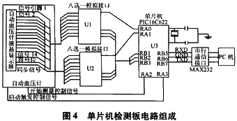 e)单片机选型。综上分析,选用具有10个I/O端口的单片机即可满足系统需求。为将信号波形整形为适合单片机需要的电平,需多个模拟电压比较器。由于PIC16C622单片机有13个I/O端口,内部还设有比较器模块,充分利用单片机的这一特点,不仅可以省去多片比较器集成芯片,且其I/O端口也可满足系统的要求。硬件电路组成示意图如图4所示。