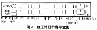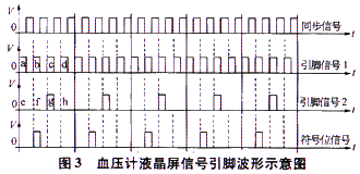 日本精工自动血压计的液晶屏由7个数码管及1个符号位组成,其中6个八段数码管分别显示高压、低压和脉搏数,1位小数码管用来显示测量次数;1个符号位可显示4种符号,分别反映4种不同的工作状态。经试验观测和逻辑分析发现,液晶屏的每个八段数码管由2个信号引脚控制,符号位有1个信号引脚,还有1个同步信号引脚,作为信号同步的基准。见图2。液晶屏信号引脚时序关系如图3所示。