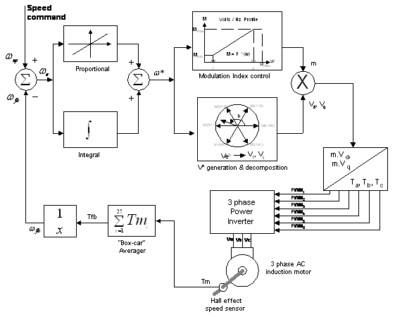 馬達驅動裝置共有三大軟體模組:變速操作所需的閉迴路空間向量PWM (SVPWM)、前端輸入功率因數修正、以及一個主要做為元件與操作面板之間界面的通訊模組。這類系統需要較大的直流電源,所以採用空間向量PWM技術,它有多項優點勝過弦波PWM等較簡單、但效率較差的機制。在特定的直流鏈 (DC-link) 電壓輸出下,空間向量PWM的三相馬達功率輸出比弦波PWM饋電馬達還高出16%。圖2就是空間向量PWM演算法的方塊圖。