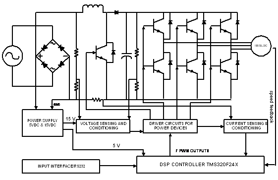 控制元件的主要工作是產生多種高頻、高解析度的脈衝寬度調變 (PWM) 訊號;另外,它還必須具備充份的運算能力來執行先進演算法,以便將轉矩漣波減至较小、進行線上參數調整與提供精確的轉速控制。除此之外,還必須縮小設計體積並減少零件數量,使它更容易生產製造。舉例來說,DSP控制器可以執行面板控制等所有内部管理功能,可有效減少所需的零件。這類元件還具備強大的彈性,不僅能為同一產品線的所有機種提供獨特不同的功能,未來還能直接透過軟體升級增強功能,而不需另行設計硬體。