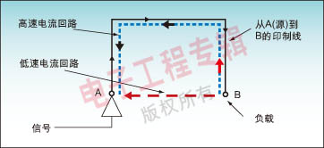 低速信号电流沿阻抗较小,即较短的路径返回源端。而高速信号则是沿电感较小的路径返回:这样的较小的回路面积位于信号线的下面,如图1所示。