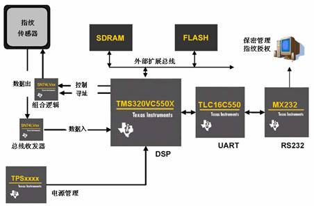 人们对指纹特征的认识由来已久,但在快速自动识别方面还是数字化的产物。一个手指的指纹特征点约在一百到一百二十之间,每个特征点以八个比特来描述将近一千个比特,在数据层面难以复制。另外其本身内在的生物特征也难以被盗取,这就难以被直接复制成指模。加之现有活体识别技术,即便复制出指模也是无济于事。其实早在PC时代人们就对指纹识别技术进行了系统的开发,但真正的实用化还是从DSP开始,特别是TI的C5402这样的经典平台。C5402具有100MIPS运算性能且在同时代的相同处理其中无论是性能与功耗,还是性能与价格都独具优势,在指纹识别应用的历史跨越了一个年代,只是后来逐步升级到C55X平台。下图所示为基于TI的C55X平台指纹识别参考框图,堪称经典应用。