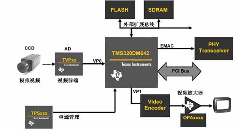 在面相识别应用中DM642是一个理想的平台,首先这是业界第一颗高性能、软件可编程的通用媒体处理器,其核心是主频为600MHz名为C64X的DSP,由于有八个并行运算单元,所以等效性能为4800MIPS。DM642集成有多个高精度数字视频接口,可以作为视频输入也可以作为视频输出,同时还有以太网接口用于传输压缩的数据流和音频输入输出接口。DM642通过扩展外围总线连接同步动态存储器和闪速存储器,在视前端可以采用TI的视频解码器、 视频放大器及电源等高性能模拟器件。