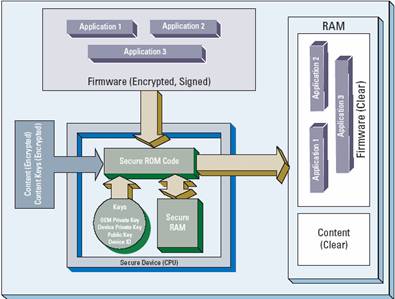 ROM 启动加载程序确认用户启动加载程序的常见方法是采用散列来确认代码是否被改动,随后再对代码解密(代码加密是为了避免有可能导致代码安全性受影响或者泄露加密信息的逆向工程破解)。一旦 ROM 启动加载程序验证了用户启动加载程序,用户启动加载程序就可依次验证并确认主应用(即应用启动加载程序),然后用户就能开始存取受保护的内容。如果处理器采用唯一的硅芯片 ID,只可以读取但不能修改,那么代码确认的安全性还能进一步提高。此外,OEM 厂商除了能用这种唯一的 ID 作为密钥根 (root for secret key) 而外,也能用它来对内容加密,使内容锁定于特定的播放器。