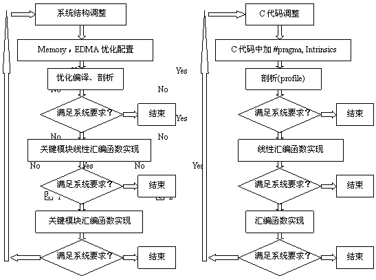 对这些关键算法模块的优化我们分可以分三步进行,如图2所示,先认真分析这部分代码,并进行相应的调整,如尽量减少有判断跳转的代码,特别是for循环中,判断跳转会打断软件流水。使用的方法,可是使用查表或者使用_cmpgtu4、_cmpeq4等Intrinsics来代替比较判断指令,从而巧妙替代判断跳转语句。同时使用TI的CCS中所提供的#pragma提供编译器尽量多的信息,这些信息包括for循环的次数信息、数据对齐信息等。如果经过这部分优化无法满足系统要求,则对这部分模块使用线性汇编实现,线性汇编是介于C和汇编之间的一种语言实现形式,可以控制指令的使用,而不必特别关心寄存器、功能单元(S、D、M、L)的分配和使用,使用线性汇编一般会比使用C语言具有更高的执行效率。如果线性汇编还无法满足要求,则使用汇编实现,要编写出高并行、深软件流水的汇编需要经过画相关图,创建时序表(Scheduling table)等步骤,由于篇幅所限,这里就不熬述。