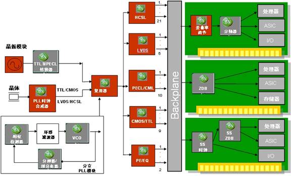 在所有电子系统中,时钟相当于心脏,时钟的性能和稳定性直接决定着整个系统的性能。典型的系统时序时钟信号的产生和分配包含多种功能,如振荡器源、转换至标准逻辑电平的部件以及时钟分配网络。这些功能可以由元器件芯片组或高度集成的单封装来完成,如图1所示。