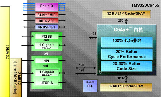 由上述性能提升点可见,C64+内核的性能提升具有一定的应用针对性,一方面加强在流媒体方面的处理能力;另一方面提升对操作系统的支持的鲁棒性。同时也通过支持紧凑指令存储和取指的方式来减少系统工程编译出来的代码尺寸。图4为使用C64+内核的TMS320C6455的结构,可以看出该DSP除片上存储空间比C6416分别提高一倍之外(L2 Memory达到2MB,L1P和L1D都为32KB),其内核在执行性能和代码大小上分别比C64内核提高20%和20%-30%。相信TI的C64+内核让业内工程师感受到TI在提升其DSP处理性能方面的承诺!