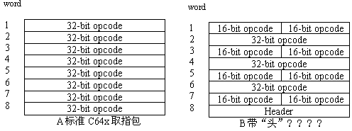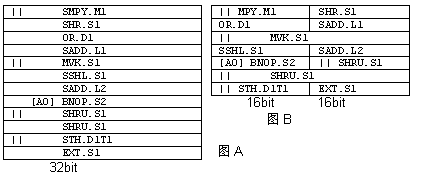 C64x DSP只支持标准的取指包(如图2A所示),而C64x+支持带“头”的取指包(如图2B所示),指令包头标注了该指令包中其它7个字中,哪些是32 bit的操作码,哪些是16 bit的操作码。支持紧凑指令一方面可以节省程序存储空间;另一方面也因此可以增加程序Cache的命中率。如图3两段程序实现相同的操作,都需9个指令周期,图A是在C64内核的存储结果,需要48 bytes,图B是在C64x+内核的存储结果只需要32 bytes。