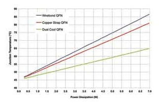 当 DaulCool 封装的器件安有散热器时,热量就会通过自然或强迫对流冷却形式从电路板传输到自由空气中。根据系统级仿真(如图 4 所示)的结果,这种散热方式可以实现比标准 QFN 封装多散去高达 80% 的热功率。