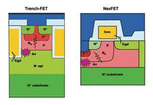 NexFET 技术可以获得与 TrenchFET技 术相似的导通电阻,而相应的寄生电容大约降低 50% 。器件底部侧面的扩散 MOS(LDMOS:横向扩散金属氧化物半导体)和垂直流动电流可以得到很高的电流密度。图 1 所示的结构显示出栅极下面的面积在源极区和漏极区重叠得很少,这就使得内部寄生电容很小。寄生电容的降低会使开关时的电荷(Qg、Qgs、Qgd)降低。因此,器件的开关速度会更快,也降低了 MOSFET 中的开关损耗。同时,驱动电路所需要的能量也比较低,这也降低了驱动器中的损耗。器件内部的密勒电荷(Qgd)影响器件开关损耗,并决定着消除Cdv/dt打开的开关能力,它的存在使效率大大降低,并有可能毁坏 MOSFET。