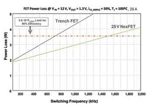 NexFET 技术改进的主要作用是它具有更低和更平的功率损耗-频率曲线(如图 2 所示)。因此,与 TrenchFET 技术相比,采用 NexFET 技术的典型的同步降压电源转换电路在维持相同功率损耗的情况下可以工作在两倍的频率。例如,如果将功率损耗限制在3W,并维持全负载效率高于 90% ,开关频率就可以从 500kHz(TrenchFET MOSFET) 增加到 1MHz(NexFET MOSFET)。当开关电源工作在更高的频率时,无源器件,例如输出电感等的尺寸就可以减少 50% ,这也改善了功率密度。