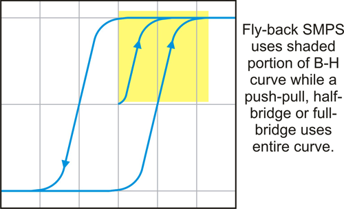 由于高功率 SMPS 的高电流会在 SMPS 变压器中造成极高的磁通量,因此使用整个 B-H 迟滞回路曲线可降低磁性核心的损耗。推挽式或半桥式拓朴可增加 SMPS 的功率,然而,设计的复杂度及成本也随之增加。