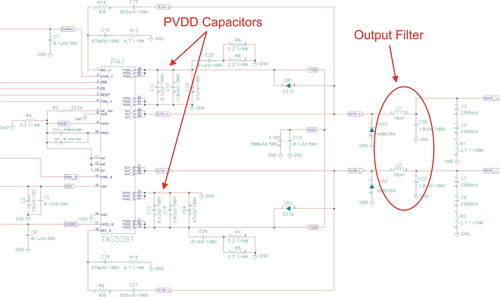 图 2. TAS5261 参考设计的 PVDD 电容及输出 LC 滤波器等组件