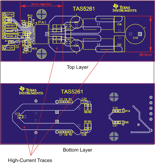 图 3. TAS5261 参考设计 PCB 的高电流信号线范例