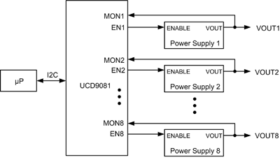 排序器为电源供应提供赋能讯号,而非提供系统 RESET 讯号。排序器一般是数字电路型或微处理器型装置,能够针对个别系统独特的各种通电及断电排序可能性与组合进行设定。电压排序器可根据时间或其他电源供应的状态启用电源供应。启用电源供应后,电源排序器会监视欠压或过压事件的电源供应,并且在这些事件发生时采取适当动作。适当动作包括停用被监视电源的供应及其他电源供应、重试失效的电源供应、取消所有电源供应的排序或采取其他设定动作。电压排序器能够以单一排序 IC控制较多 8 个电源供应。排序器 ICs 可在必要时串接,以提供 8 个以上电源供应的排序。图 5 显示的是 8 信道电压排序器的一般配置。